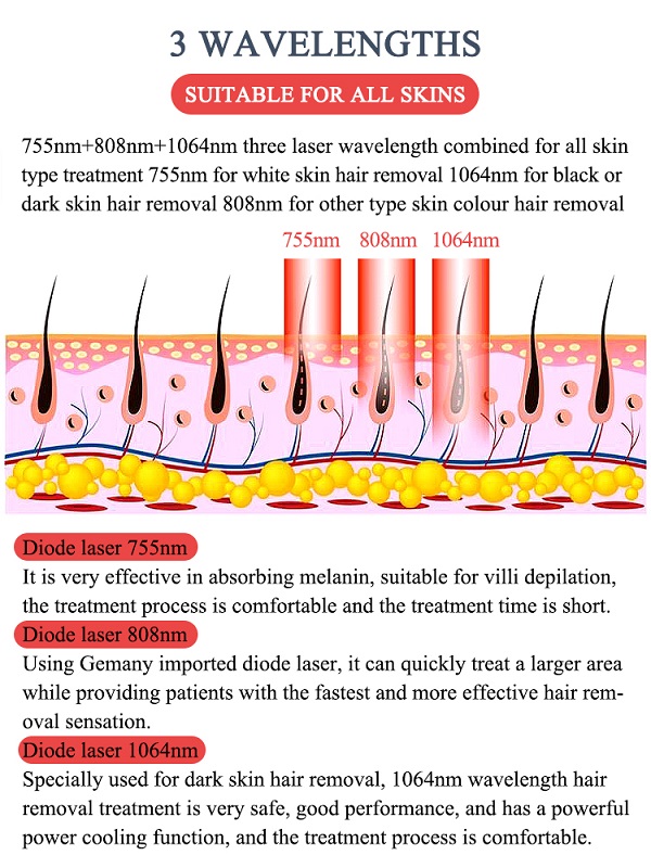 3 WAVELENGTHS SUITABLE FOR ALL SKINS 755nm+808nm+ 1064nm three laser wavelength combined for all skin type treatment 755nm for white skin hair removal 1064nm for black or dark skin hair removal 808nm for other type skin colour hair removal.