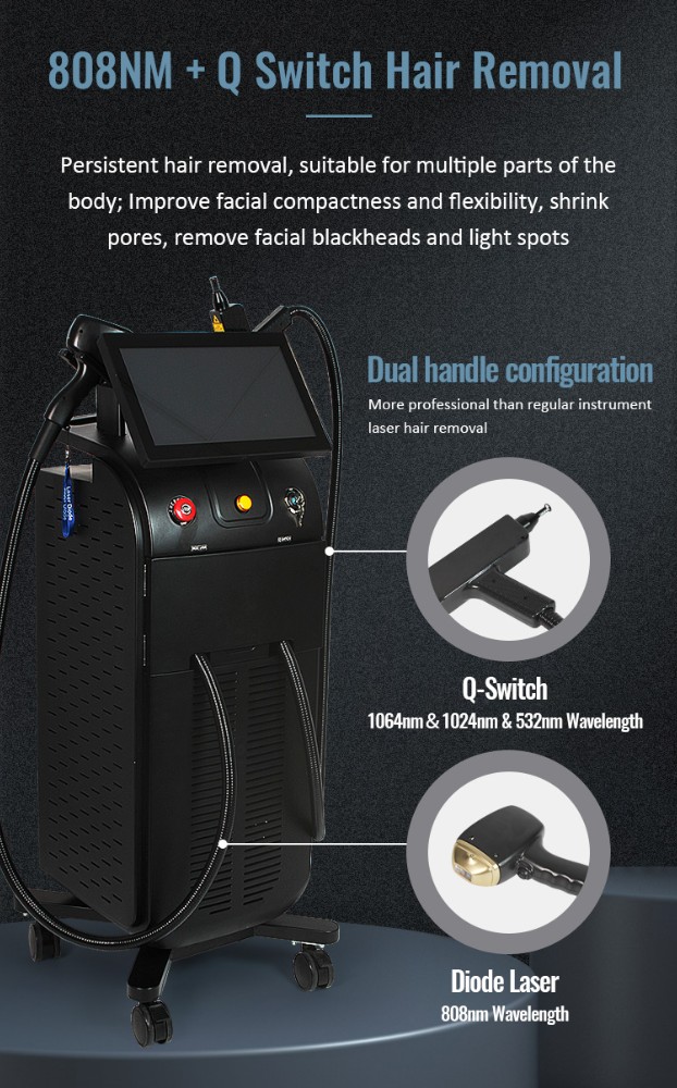 Semiconductor lasers are stacked with ultra-micro semiconductor laser chips. The basic treatment principle is biological effect. The laser emitted by this machine is easily absorbed by colored hair follicles without damaging the epidermal tissue. The energy emitted by the light is absorbed by hair and pigments in hair follicles. After being converted into heat, the temperature of the hair follicles is increased. When the temperature rises to a certain level, the hair follicles will be irreversibly damaged. After a period of time, the damaged hair follicles will be removed with the body's metabolism to achieve the purpose of permanent hair removal. Modern design, stable output, short exposure time, good effect of permanent hair removal, high safety.