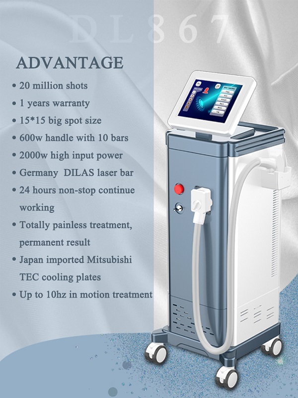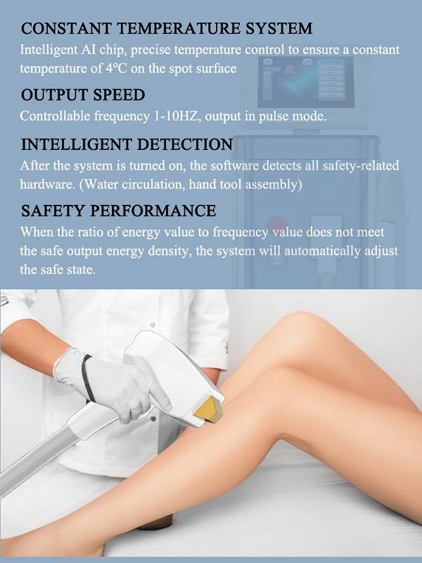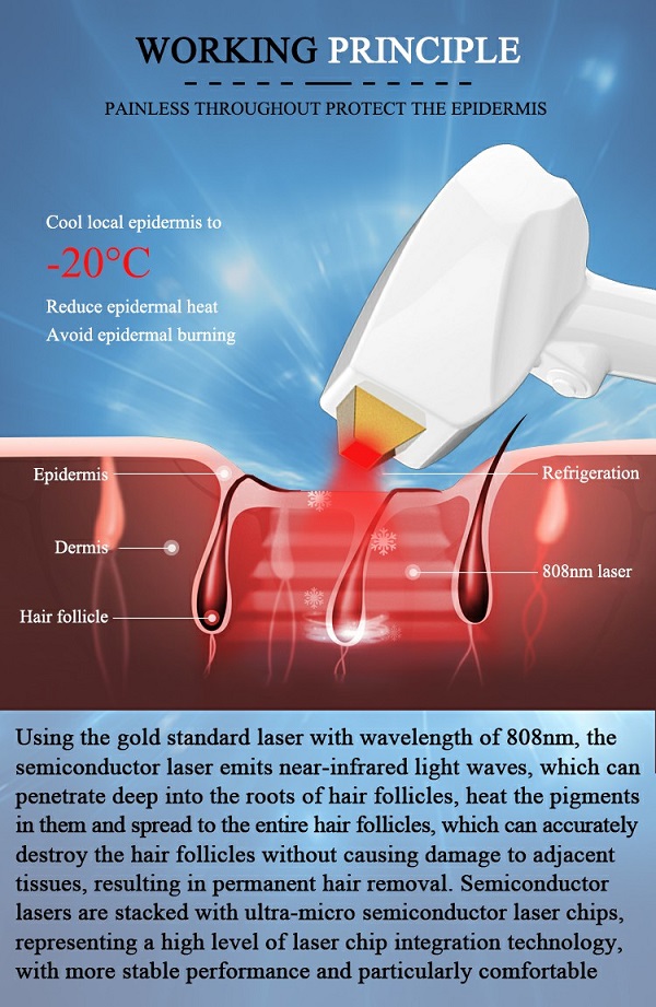 penetrate deep into the roots of hair follicles, heat the pigments in them and spread to the entire hair follicles, which can accurately destroy the hair follicles without causing damage to adjacent tissues, resulting in permanent hair removal. Semiconductor lasers are stacked with ultra-micro semiconductor laser chips,representing a high level of laser chip integration technology,with more stable performance and particularly comfortable.