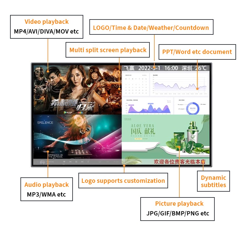 The outdoor wall mounted advertising machine adopts leading display technology and powerful processing capabilities, ensuring excellent high-definition display effects. Whether it's beautiful static images or dynamic promotional videos, they can be presented with extremely high resolution and delicacy, making every detail perfect and conveying information more accurately and vividly. In addition, it is compatible with multiple formats of multimedia file playback, including but not limited to JPEG, PNG, GIF, MP4, MKV, AVI and other image and video formats, and even supports real-time network streaming media playback, providing advertisers with rich creative space and unlimited possibilities. This comprehensive media playback capability gives outdoor wall mounted advertising machines a significant advantage in attracting audience attention.