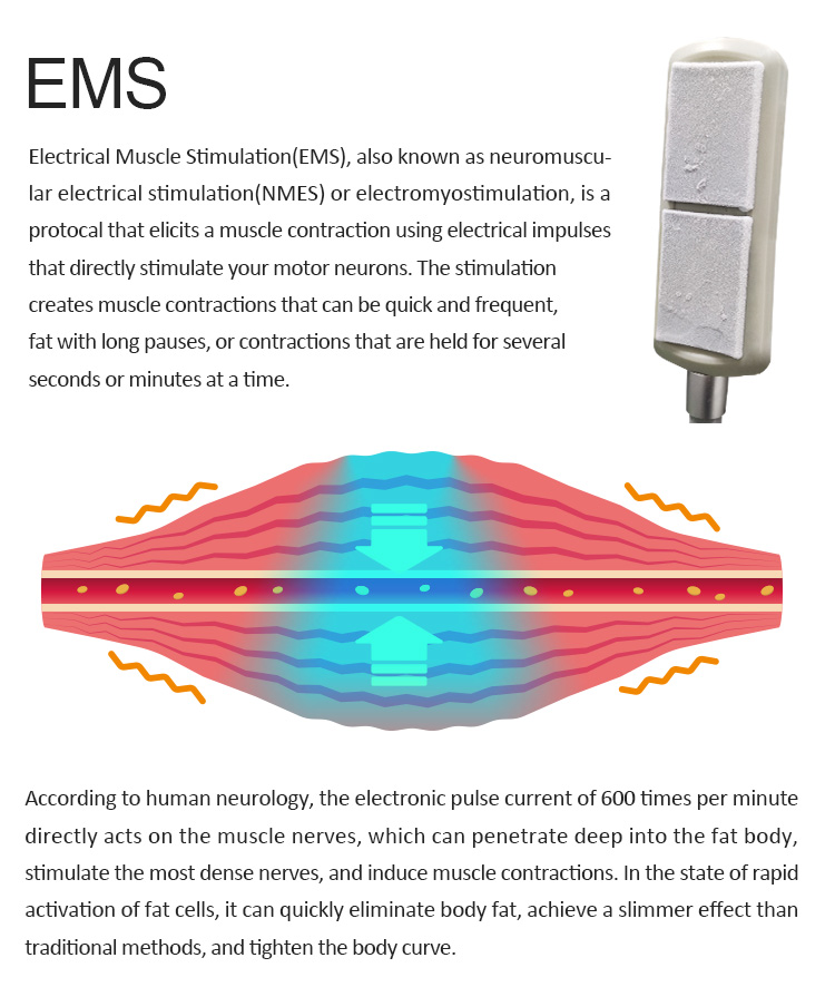 Electrical Muscle Stimulation(EMS), also known as neuromuscular electrical stimulation(NMES) or electromyostimulation, is a protocal that elicits a muscle contraction using electrical impulses that directly stimulate your motor neurons. The stimulation creates muscle contractions that can be quick and frequent, fat with long pauses, or contractions that are held for several seconds or minutes at a time.
