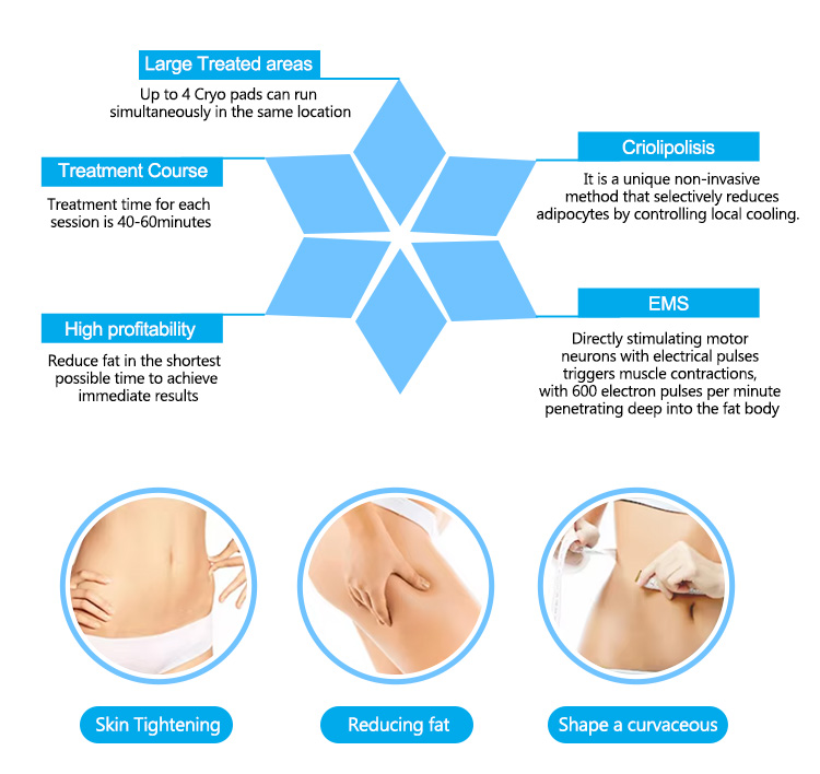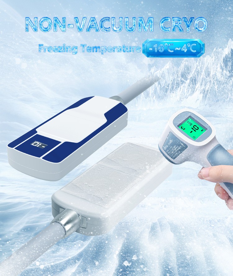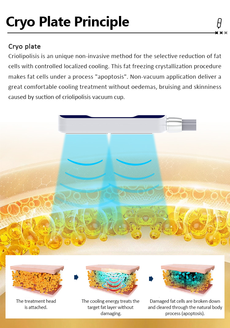 Cryotherapy is an unique non-invasive method for the selective reduction of fat cells with controlled localized cooling. This fat freezing crystallization procedure makes fat cells under a process "apoptosis". Non-vacuum application deliver a great comfortable cooling treatment without oedemas, bruising and skinniness caused by suction of criolipolisis vacuum cup.