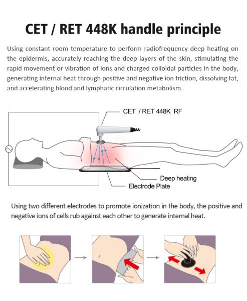 The projection of high frequency energyinto the body produces deep heat from thedermis of the skin and decomposes body fatfor the purpose of weight loss. Whenhigh-frequency current is applied to thebody tissues, there is little ionic movementdue to its very low vibration amplitude, andno electrochemical reaction or electrical de-composition is produced. If high frequenciesare conducted to the body, the body tissues will heat up.